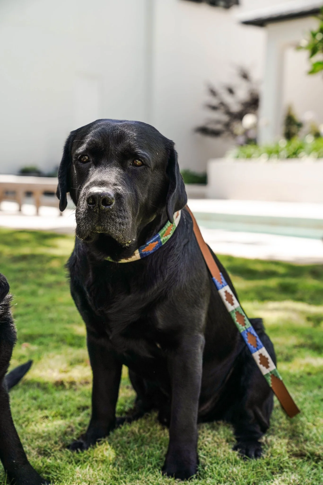 World-class light brown Argentine leather with green, white & blue nylon thread, artfully hand-stitched in Buenos Aires. Â Total length of the leash is just under 4 feet.